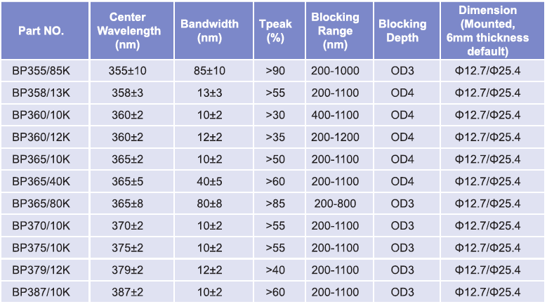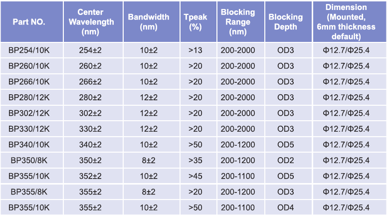 帶通濾光片波長(zhǎng)范圍:254nm-355nm