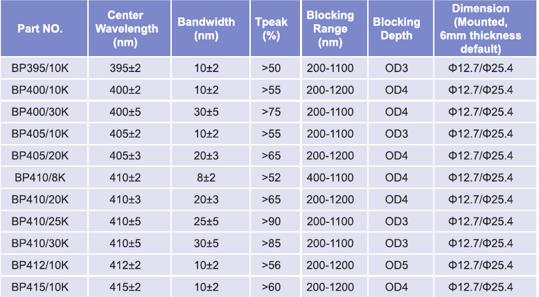 帶通濾光片波長(zhǎng)范圍:395nm-415nm