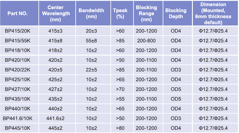 帶通濾光片波長(zhǎng)范圍:415nm-445nm