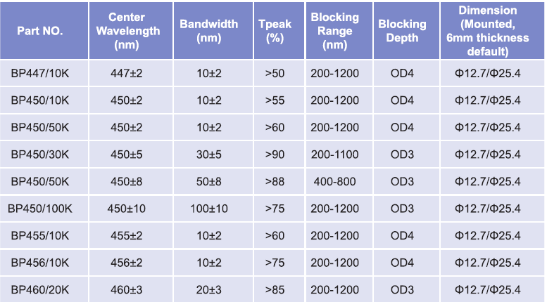 帶通濾光片波長(zhǎng)范圍:447nm-460nm