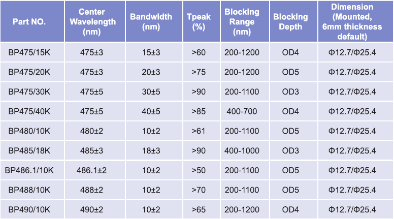 帶通濾光片波長(zhǎng)范圍:475nm-490nm
