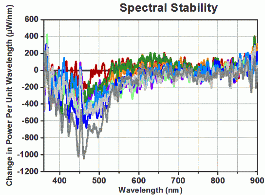 這些曲線是把光源啟動后不同時間的光譜減去一個起始參考光譜的結(jié)果。不同顏色是不同的時間的光譜數(shù)據(jù)(0.2h-24h))