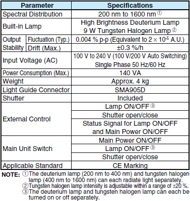 通過使用安裝在同一外殼內(nèi)的高亮度氘燈和鹵鎢燈,該光源能通過光波導(dǎo)(單賣)輸出200nm到1600nm的光。輸出的光強(qiáng)大約是現(xiàn)有型號的兩倍。緊湊的尺寸和較輕的重量使其易于攜帶。機(jī)械快門和外部控制等實(shí)用的功能使其易于使用。這種新型光源同時適用于多種型號的便攜式設(shè)備。