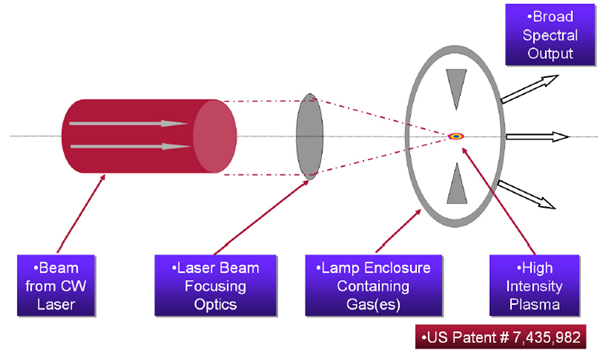 量來維持燈泡內(nèi)的等離子體,此時(shí)高壓即可關(guān)閉,采用聚焦良好的激光來維持等離子體,